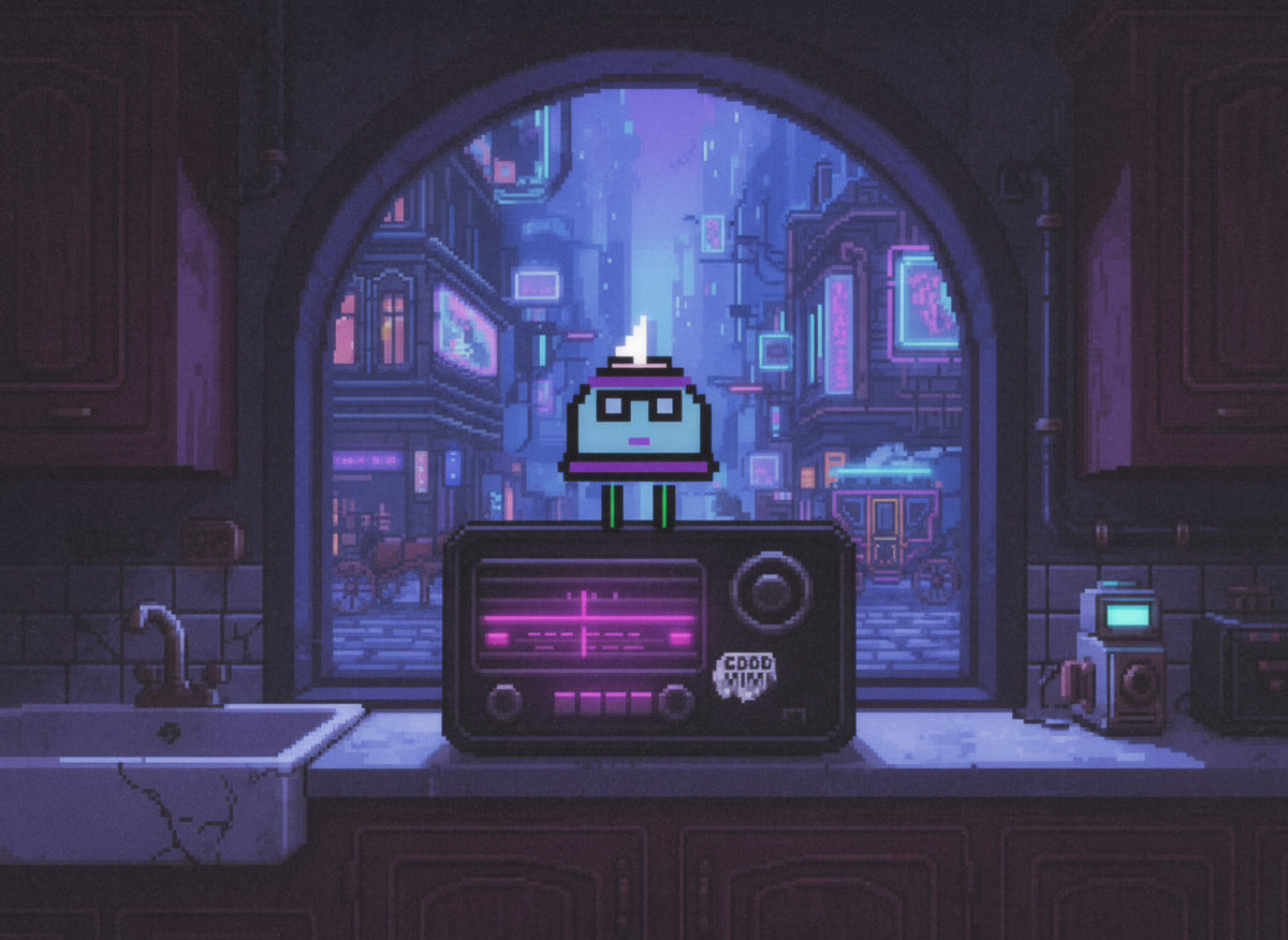 CryptoPlug #175 lived in Brixham, one of the oldest neighbourhoods in the city of Ion. She powered a kitchen radio, a sturdy little box with worn buttons and a faded sticker that once said “Good Vibes Only.” Kids had peeled half of it off years ago. Every morning at 6.45am the woman tapped her fingers to the rhythm of jazz music while sipping her coffee. Dogs barking in the alleys, brass clanking. From her socket, as she did every day, #175 gazed out the kitchen window. Mornings in Brixham were cold and metallic, with cyan and acid-green slicing through mist and steam. Brick factories framed the grey sky and iron bridges arched over a maze of pipes. The metallic soundscape blended into the background of the radio’s broadcast.